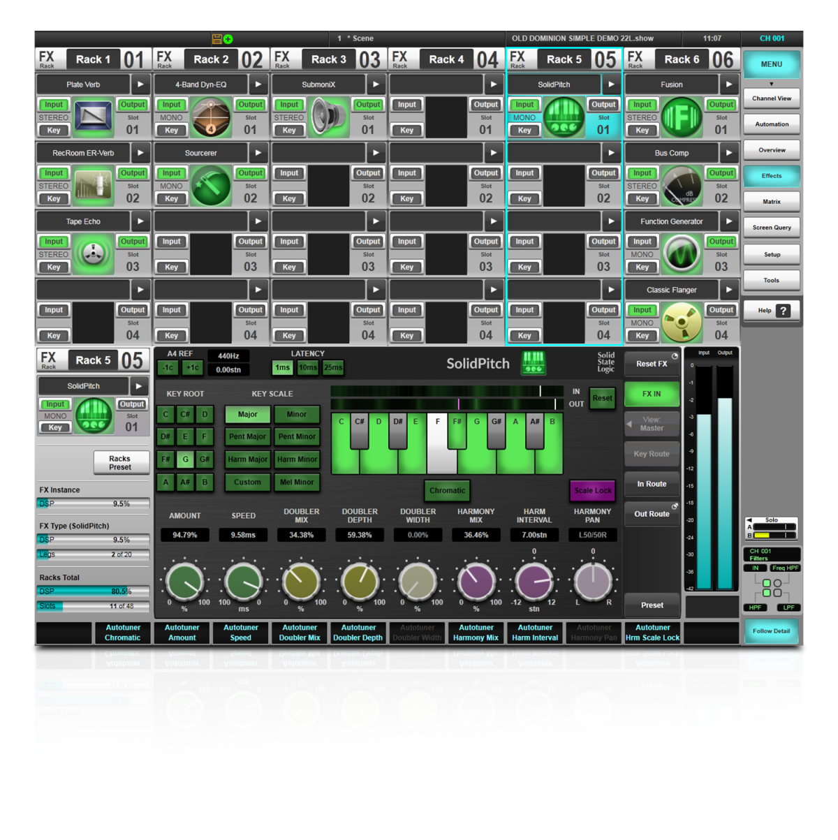 El rack de efectos interno de la consola ahora se puede visualizar en una pantalla externa conectada, lo que ofrece a los ingenieros una mayor visibilidad y control sobre efectos clave como SolidPitch o un compresor aplicado a la voz principal, por ejemplo. Los efectos de medición, como el medidor de SPL o el espectrómetro, se pueden visualizar para supervisar constantemente la información de la señal.