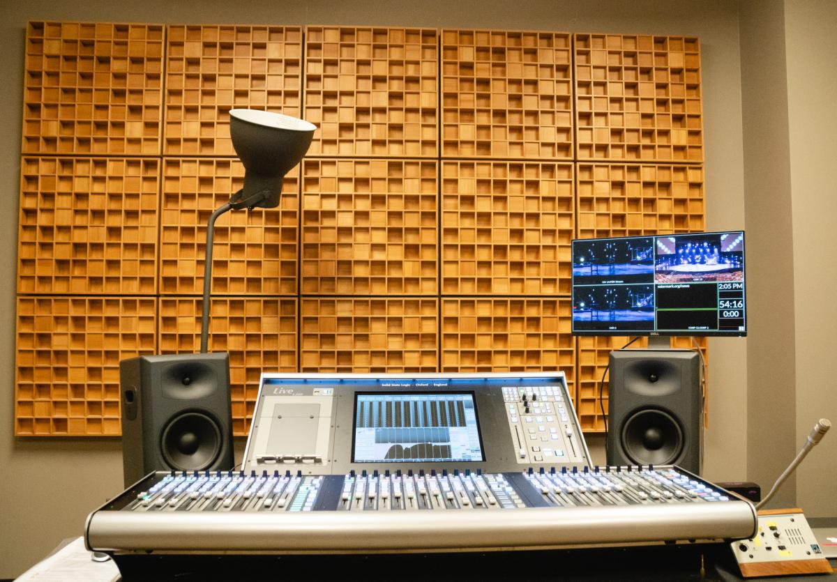 Se graban determinados servicios: «Utilizábamos Tracks Live de Waves, que ya ha dejado de fabricarse, así que están barajando otra solución», explica. Las grabaciones multipista se controlan desde la mesa de sala L350. «Tenemos la función de control de DAW conectada a la mesa. Podemos iniciar y detener el transporte. Pero ahora todas las entradas están disponibles a través de Dante, por lo que podríamos acceder a ellas desde cualquier lugar».