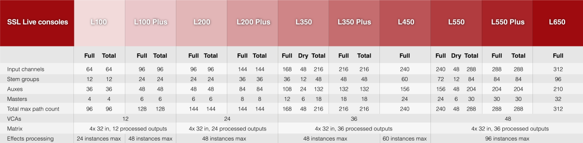 La gama de consolas SSL Live cuenta con seis modelos: la L650, la L550 Plus, la L450, la L350 Plus, la L200 Plus y la L100 Plus. En SSL creemos que ofrecer una gama de tamaños y especificaciones de consolas no debe suponer renunciar a la calidad ni a las prestaciones.