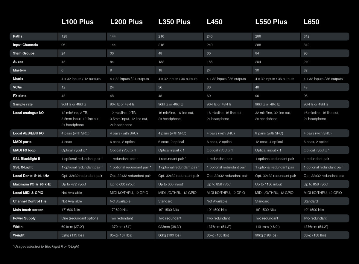 La gama de consolas SSL Live cuenta con seis modelos: la L650, la L550 Plus, la L450, la L350 Plus, la L200 Plus y la L100 Plus. En SSL creemos que ofrecer una gama de tamaños y especificaciones de consolas no debe suponer renunciar a la calidad ni a las prestaciones.