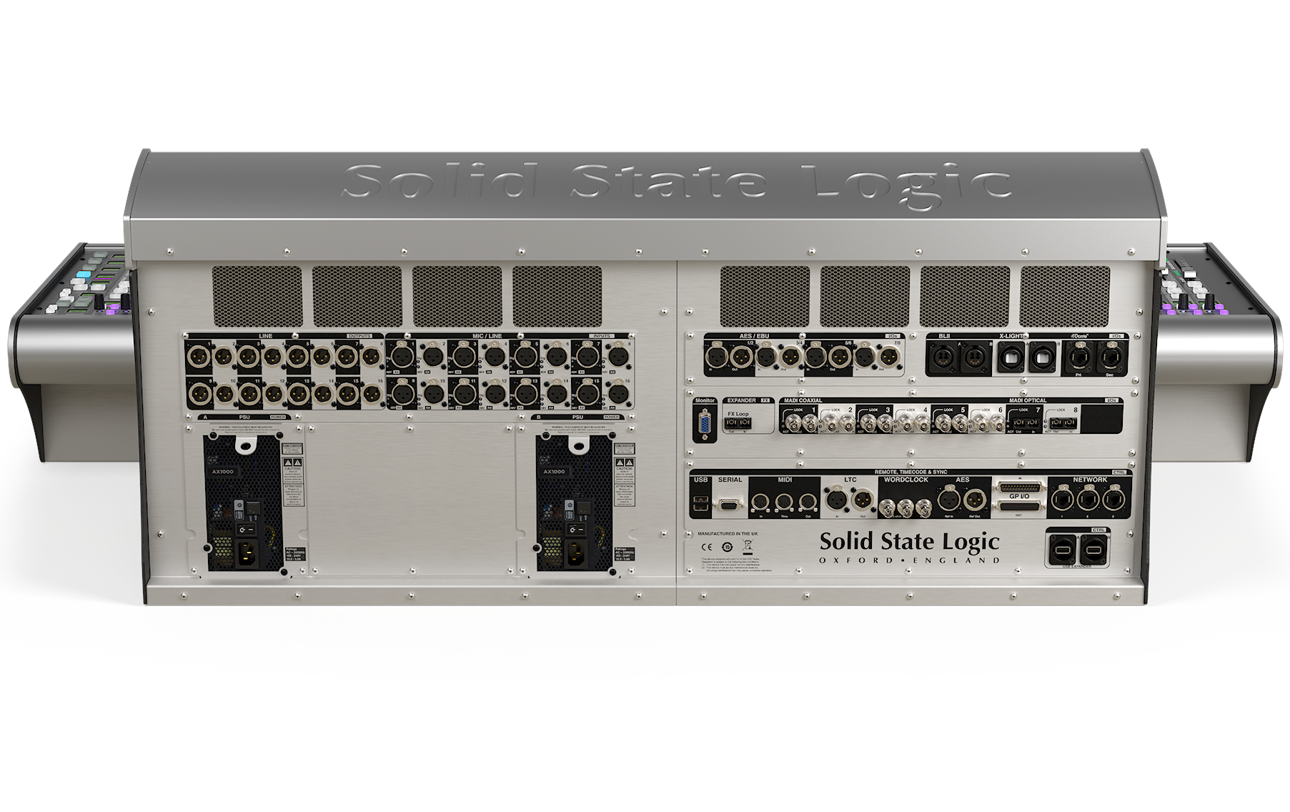 Configuración estándar de los puertos MADI: 6 pares redundantes de cable coaxial y 2 de fibra óptica (no redundantes). Si no se requiere redundancia, estas conexiones pueden ser independientes, lo que ofrece un máximo de dieciséis puertos. Además, hay un puerto MADI óptico independiente (salida/entrada), diseñado para utilizarse como «bucle de efectos» (FX Loop) para conectar un dispositivo de efectos externo, como un sistema que utilice Waves Multirack o un host de efectos VST. La configuración estándar ofrece conectores SSL Blacklight II. También hay disponible una tarjeta Dante que ofrece 32x32 canales de E/S a 96 kHz (o 64x64 canales a 48 kHz) a través de una conexión Dante redundante. Un par redundante de conectores SSL X-Light proporciona 256 canales bidireccionales a 96 kHz entre la consola y el escenario mediante un único cable con conectores reforzados. El panel trasero también alberga conectores para MIDI, LTC, Wordclock y E/S GP. La consola cuenta con fuentes de alimentación redundantes.