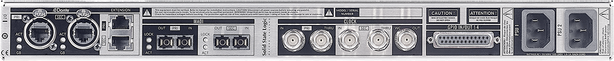 MADI-Bridge también ofrece conversión bidireccional de frecuencia de muestreo entre cualquier frecuencia asíncrona, desde 44,1 kHz hasta 192 kHz. MADI-Bridge cuenta con fuentes de alimentación, puertos MADI y puertos de red IP redundantes y, además de las opciones de redundancia de reloj integradas en Dante Controller, MADI-Bridge también incluye un par de entradas de sincronización redundantes para su uso como reloj maestro PTPv1 y/o PTPv2 autorredundante. El túnel de control MADI de 32 bits permite utilizar un par de MADI-Bridge para transmitir el audio y los bits de usuario (incluidos los datos de control) de un flujo MADI completo a través de una red.