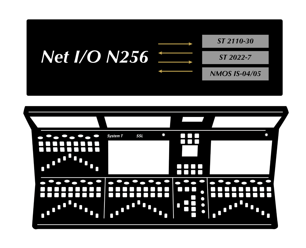 Net I/O N256 es una interfaz de 256 canales para conectar el System T con redes ST 2110. Cada N256 proporciona hasta 128 flujos ST 2110-30 de transmisión (Tx) y 128 de recepción (Rx), incluyendo compatibilidad total con flujos ST 2110-30 de los niveles A, B y C, así como con la redundancia de flujos ST 2022-7. Se incluye la funcionalidad NMOS IS-04 e IS-05 para la detección y la gestión de conexiones, o bien se puede utilizar la aplicación SSL Connect (a la que se accede a través de un navegador web) para la configuración centralizada de flujos, el control de enrutamiento y la asignación de canales. La separación de redes proporciona un cortafuegos entre la consola y las redes ST 2110, lo que simplifica los requisitos de integración. El N256 incluye conectividad de red redundante y fuentes de alimentación duales.
