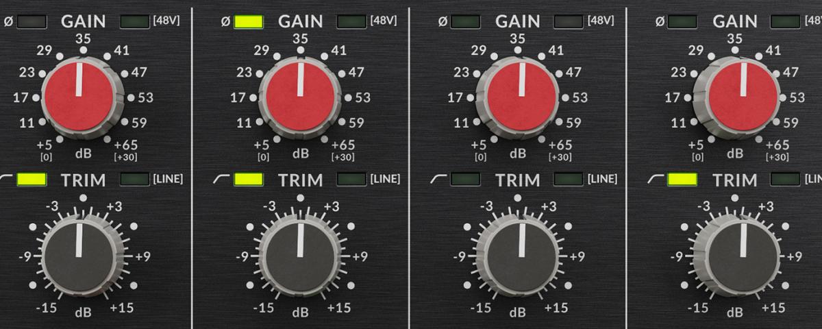 • Control Trim de 31 pasos, con incrementos precisos de 1 dB: satura la señal con el control Gain y, a continuación, redúcela a un nivel adecuado mediante el control Trim.