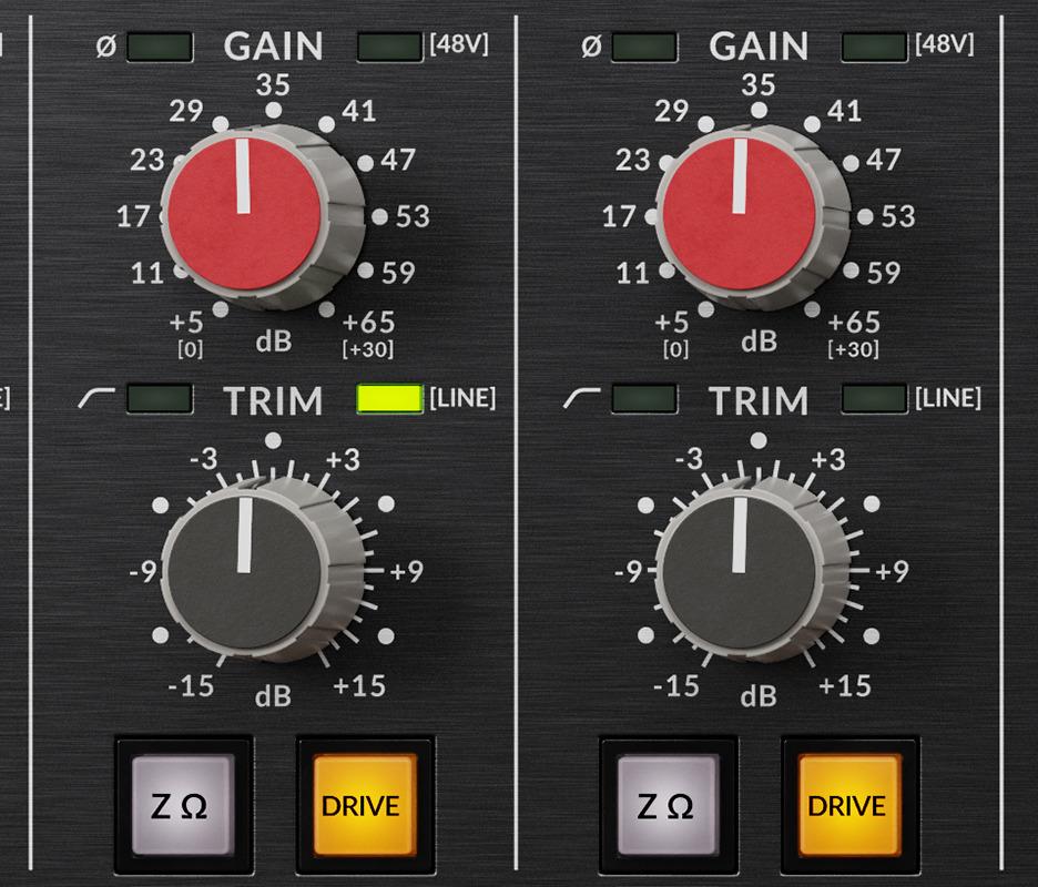 TRIM: control de ajuste de 31 pasos, con incrementos precisos de 1 dB; sobrecarga la señal con el control de ganancia y, a continuación, redúcela a un nivel adecuado mediante el control Trim.