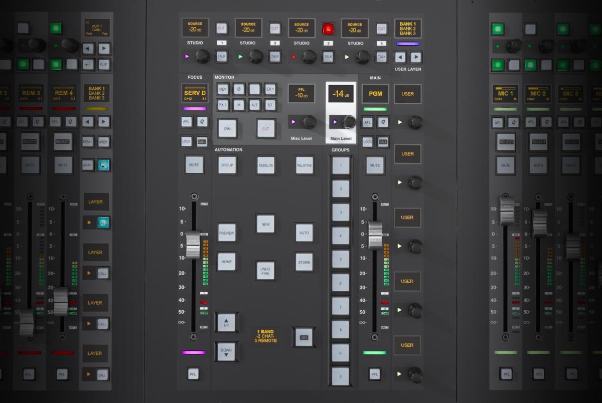 Los paneles de faders permiten un control directo de las rutas de señal. Se pueden configurar libremente para controlar una gran variedad de rutas de señal diferentes mediante un código de colores claro y brillante. Cada panel cuenta con 16 faders distribuidos en cinco capas, con cuatro bancos por capa. Cada banda de faders incluye un fader motorizado de 100 mm, un medidor de nivel y un conjunto de LED de estado que indican la dinámica, el modo De-ess, la mezcla automática de diálogos y el control remoto AFV o de automatización de producción. Hay una tecla PFL Solo dedicada, además de un fader PFL con tope trasero. Hay teclas adicionales para Mute, AFL y Select, que controlan un menú de funciones de la placa junto con la interfaz de pantalla táctil. Una pantalla OLED de tres líneas ofrece una variedad de información visual de los datos. En la parte superior de la banda hay un Quick Encoder multifunción con tres interruptores. Cada banda cuenta con la aclamada tecla «Super-Q» de SSL, que permite al usuario distribuir los elementos contribuyentes o los destinos de un fader o ruta seleccionados por toda la superficie de control, proporcionando información instantánea y control de la mezcla desde una vista centrada en el canal o en la mezcla. Al consultar un canal, se muestran los destinos a los que está enrutado. Al consultar un bus de mezcla, se muestran los canales que contribuyen a esa mezcla.