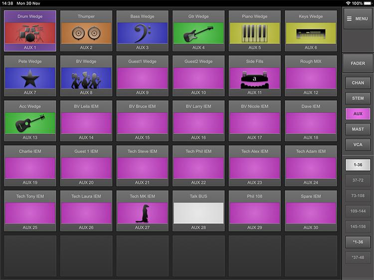 La aplicación TaCo puede ser utilizada tanto por ingenieros de monitorización como por artistas. La aplicación puede limitarse a controlar los niveles de una mezcla auxiliar concreta o desbloquearse desde la consola para controlar de forma rápida y sencilla todas las mezclas desde una sola pantalla. Se pueden conectar varias tabletas simultáneamente para proporcionar capacidades de mezcla a cada intérprete en el escenario. TaCo utiliza la misma tecnología Query que la consola Live, lo que significa que solo se muestran los canales enrutados al Aux seleccionado. Utilizando los grupos Stem de la consola Live, los canales de entrada se pueden combinar en subgrupos lógicos para proporcionar al intérprete un conjunto simplificado de faders.